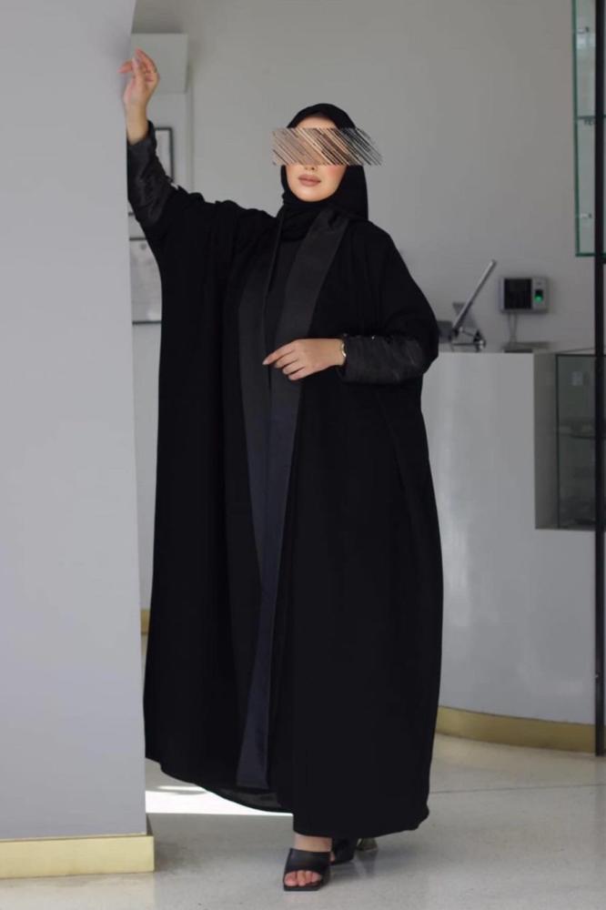 القماش :كريب ملكي كوري سواد فاحم انيق نسيج ناعم و انسيابي مريح.